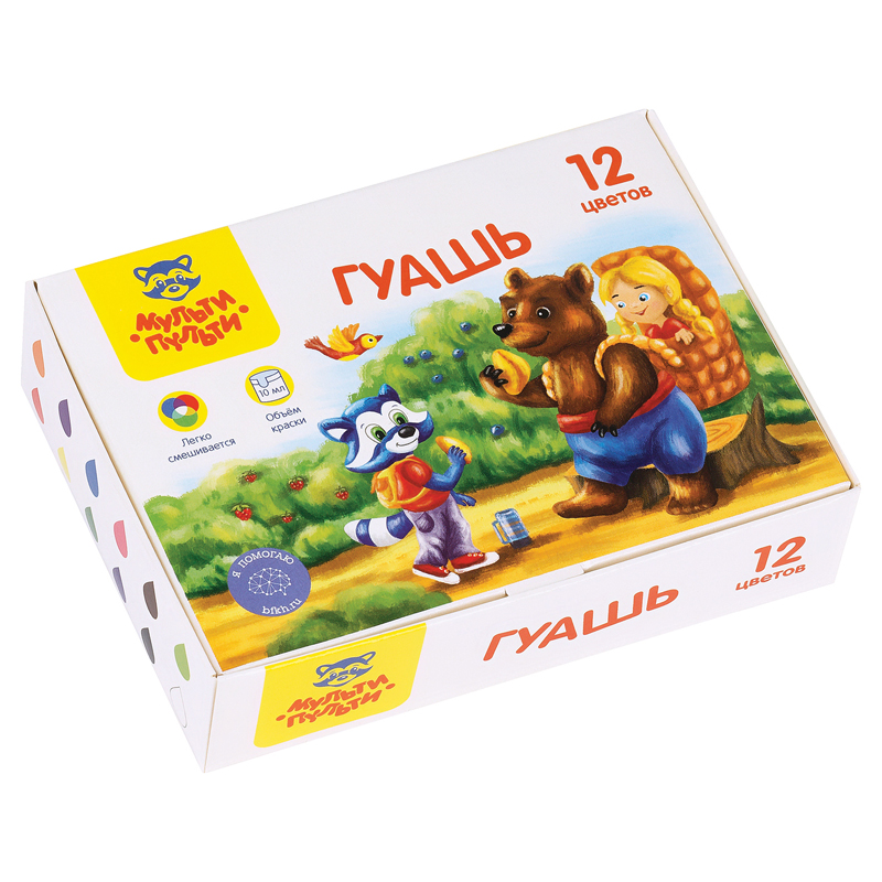Гуашь Мульти-Пульти Енот в сказке , 12 цветов, 10мл, картон (ГК_43560)описаниеГуашь «Мульти-Пульти» серии «Енот в сказке» создана специально для детского творчества и декоративно-оформительских работ. Краски подходят для рисования по бумаге, картону, дереву, стеклу, керамике. Для детей старше 3-х лет. В наборе имеются 12 баночек разных цветов: оранжевый, фиолетовый, голубой, розовый, коричневый, светло-зеленый, красный, желтый, зеленый, синий, черный, белый. Объем каждой баночки с завинчивающейся крышкой - 10 мл, общий объем - 120 мл.