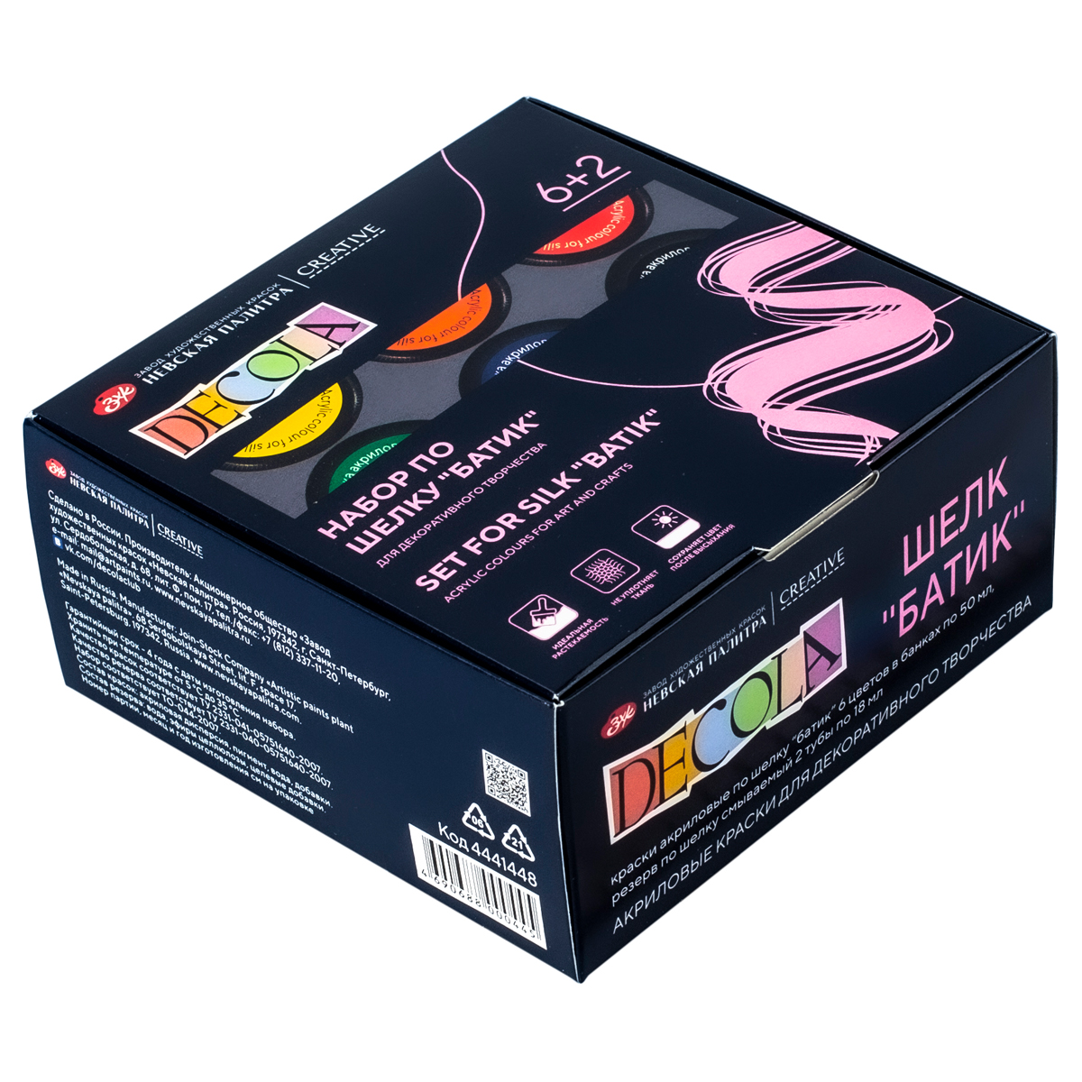 Набор по шелку Decola, краски акриловые 6*50мл, 2 резерва (4441448)описаниеАкриловые краски по шелку батик серии Decola предназначены для работы в технике холодный батик и свободной росписи по различным тонким синтетическим и натуральным тканям. Легко наносятся кистью, обладают хорошей растекаемостью и глубоко проникают в волокна ткани, при этом не вызывают уплотнения материала. Быстро сохнут, закрепляют горячим утюгом с изнаночной стороны изделия. Для удобства банки в наборах оснащены стикерами на крышках с указанием цвета и типа краски. Сумма заказа всех товаров с этого склада должна быть не менее 3000 р. Доставка от 4 дней
