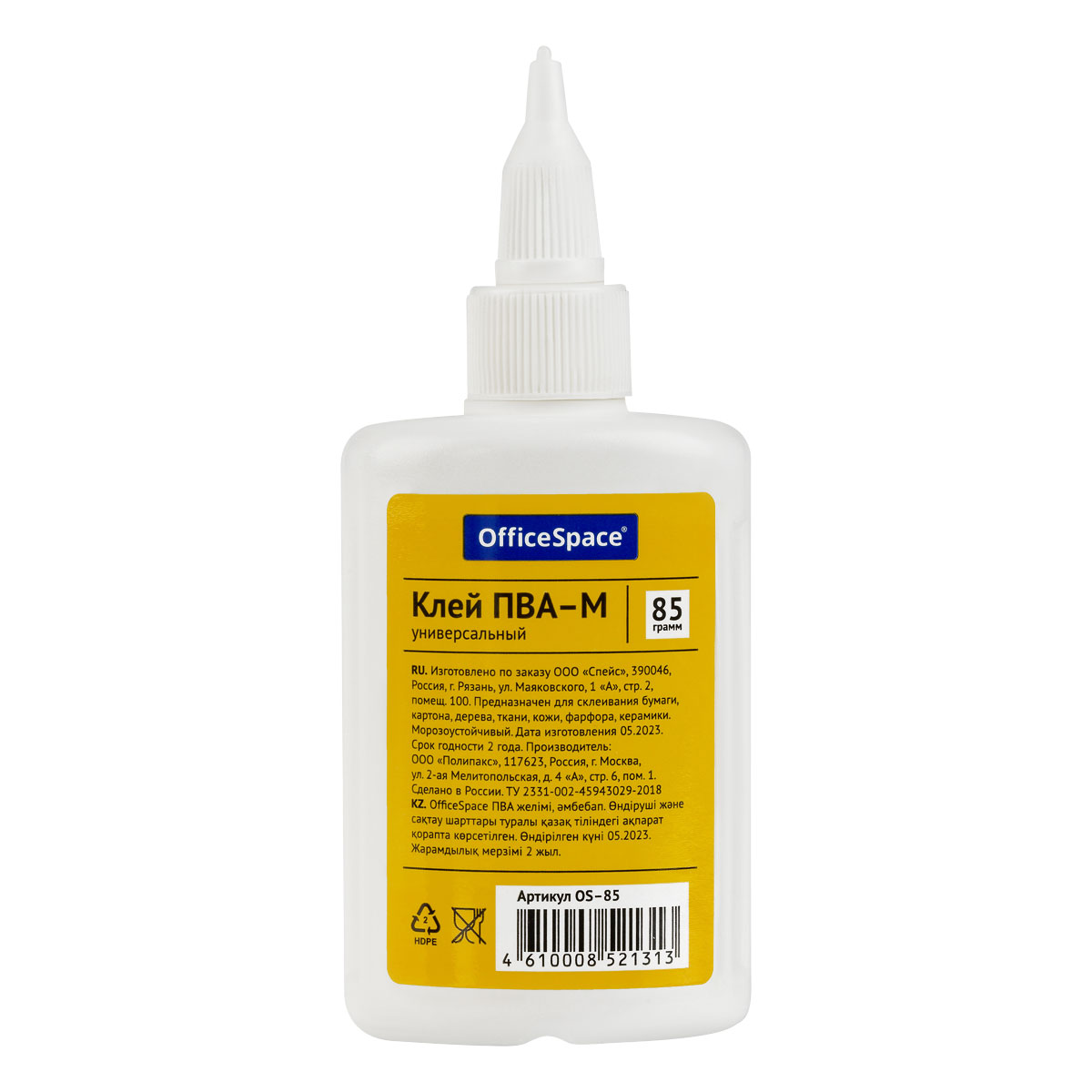 Клей ПВА OfficeSpace, 85г, с дозатором (OS-85)описаниеПредназначен для склеивания бумаги, картона, дерева, стекла, кожи, ткани, фарфору. Клей морозостойкий. Выдерживает 5 циклов заморозки/разморозки при температуре до -25°С. Удобная пластиковая упаковка с экономичным дозатором. Клей необходимо закрывать после использования. Не токсичен. Сумма заказа всех товаров с этого склада должна быть не менее 3000 р. Доставка от 4 дней
