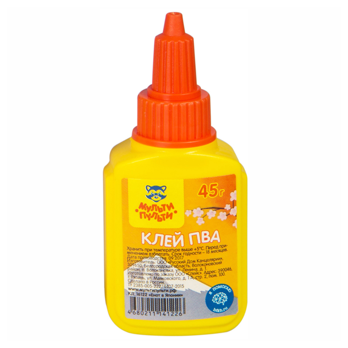 Клей ПВА Мульти-Пульти Енот в Японии , 125г (КЛ_16124)описаниеПредназначен для склеивания бумаги, картона, дерева, стекла, кожи, ткани. Клей морозостойкий. Выдерживает 5 циклов заморозки/разморозки при температуре до -40°С. Хранить при температуре выше +5°С. Удобная пластиковая упаковка с экономичным дозатором. Отлично подходит для создания поделок и работы на уроках труда. Для детей старше 3-х лет. Перед использованием взболтать. Упаковка в термоусадку по 10 шт. Сумма заказа всех товаров с этого склада должна быть не менее 3000 р. Доставка от 4 дней