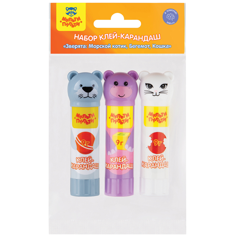 Набор клей-карандаш Мульти-Пульти Зверята: Морской котик, Бегемот, Кошка , 09г, колпачок в форме животного, ПВП, пакет, европодвес (GS_41911)описаниеКлей-карандаш «Мульти-Пульти» серии «Зверята: Морской котик, Бегемот, Кошка» с колпачком в форме животных – незаменимый помощник на уроках труда и занятиях творчеством. В набор входит 3 клея-карандаша по 9 граммов. Улучшенная формула на основе ПВП позволяет хорошо склеивать изделия из бумаги, картона, ткани. Клей быстро сохнет, нейтрален по запаху, легко смывается водой, не токсичен. Состав не содержит растворителей. Экономичный расход позволяет заниматься творчеством каждый день. Колпачки в фор ... [Подробнее на странице товара]Сумма заказа всех товаров с этого склада должна быть не менее 3000 р. Доставка от 4 дней