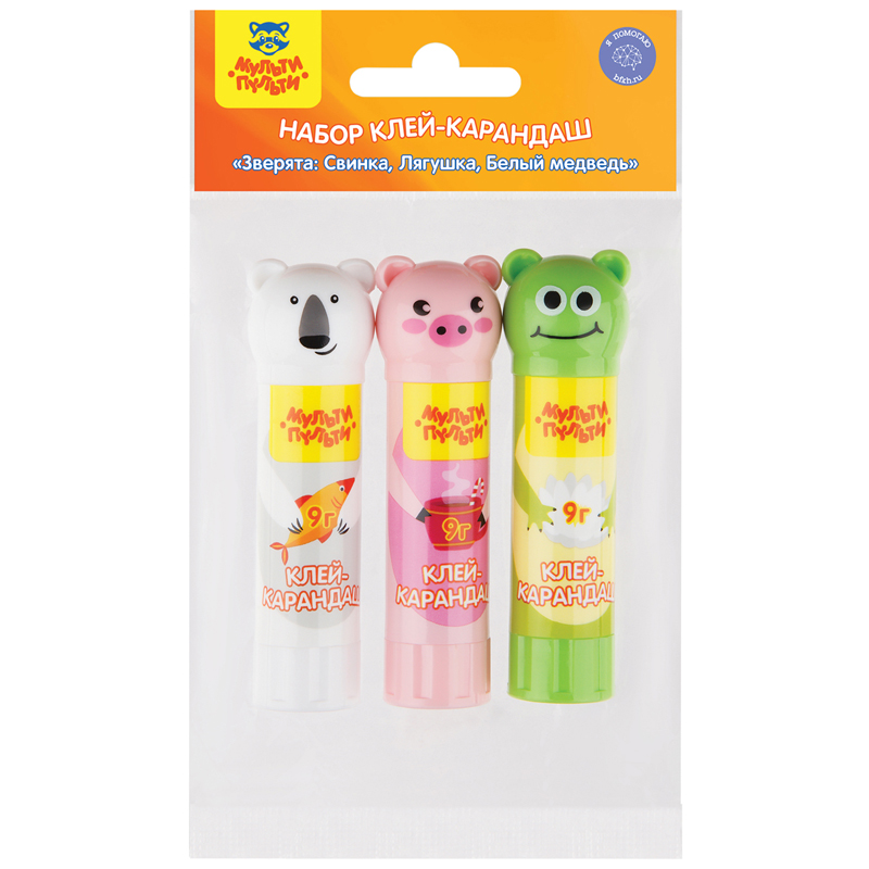 Набор клей-карандаш Мульти-Пульти Зверята: Свинка, Лягушка, Белый медведь , 09г, колпачок в форме животного, ПВП, пакет, европодвес (GS_41913)описаниеКлей-карандаш «Мульти-Пульти» серии «Зверята: Свинка, Лягушка, Белый мишка» с колпачком в форме животных – незаменимый помощник на уроках труда и занятиях творчеством. В набор входит 3 клея-карандаша по 9 граммов. Улучшенная формула на основе ПВП позволяет хорошо склеивать изделия из бумаги, картона, ткани. Клей быстро сохнет, нейтрален по запаху, легко смывается водой, не токсичен. Состав не содержит растворителей. Экономичный расход позволяет заниматься творчеством каждый день. Колпачки в форм ... [Подробнее на странице товара]Сумма заказа всех товаров с этого склада должна быть не менее 3000 р. Доставка от 4 дней