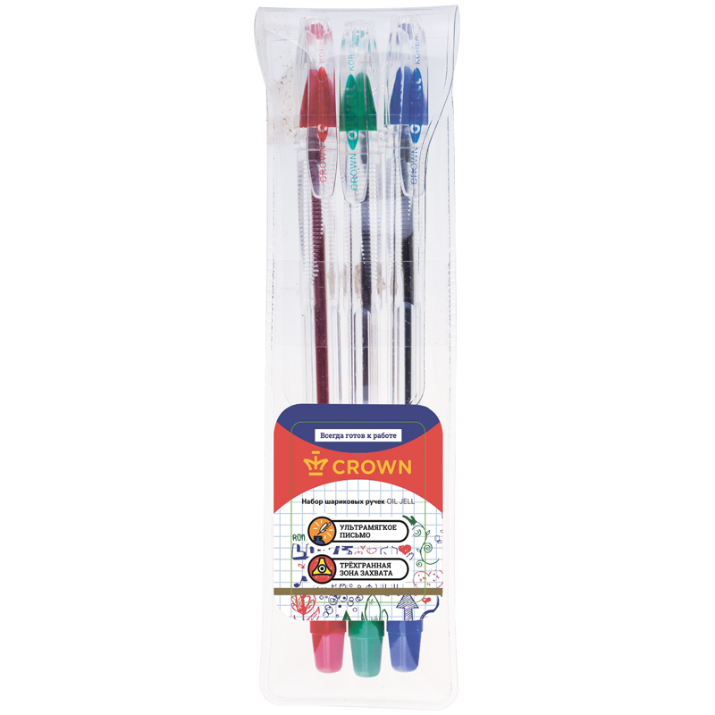 Набор шариковых ручек Crown Oil Jell 3шт., 03цв., 0,7мм, ПВХ уп., европодвес (OJ-500S/КСЗ)описаниеШариковая чёрная ручка Crown Oil Jell – это функциональный инструмент для ежедневного использования. Диаметр пишущего узла 0,7 мм, благодаря чему ручка подойдет для любого стиля письма. Она подойдет для заполнения бланков, ведения дневника или скетчинга. Рифленая зона захвата снижает давление на пальцы рук при письме. Чернила на масляной основе пониженной вязкости обеспечивают мягкое ровное письмо и уверенное скольжение по бумаге. Легкий прозрачный корпус достаточно лаконичен по форме и весьма ... [Подробнее на странице товара] Сумма заказа всех товаров с этого склада должна быть не менее 3000 р. Доставка от 4 дней