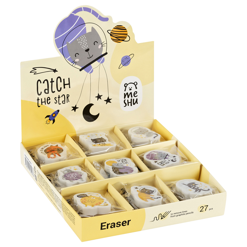 Ластик MESHU Space Cat – яркий и забавный помощник в школе, офисе и дома. Ластики фигурной формы выполнены из высококачественной термопластичной резины. Представлено ассорти из 9 веселых дизайнов ластика белого цвета с рисунком милых котиков. Размер – 40*30*13 мм. Отлично стирает чернографитный карандаш. Ластики представлены в дисплей-боксе, каждый упакован в отдельный пакет.
