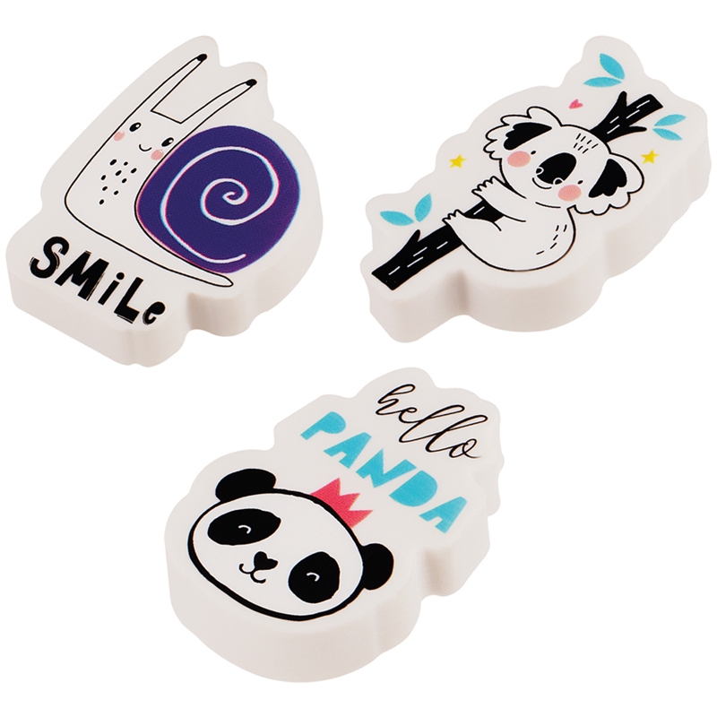 Набор ластиков MESHU Cute friends 3шт., фигурный, термопластичная резина, 40*30*13мм, пакет, европодвес (MS_41774)описаниеНабор ластиков MESHU Cute friends – забавный помощник в школе, офисе и дома. Ластики фигурной формы выполнены из высококачественной термопластичной резины. В наборе 3 весёлых дизайна ластика белого цвета с рисунком в тематике милых животных. Размер – 40*30*13 мм. Отлично стирает чернографитный карандаш. Набор ластиков представлен в пакете с подвесом.