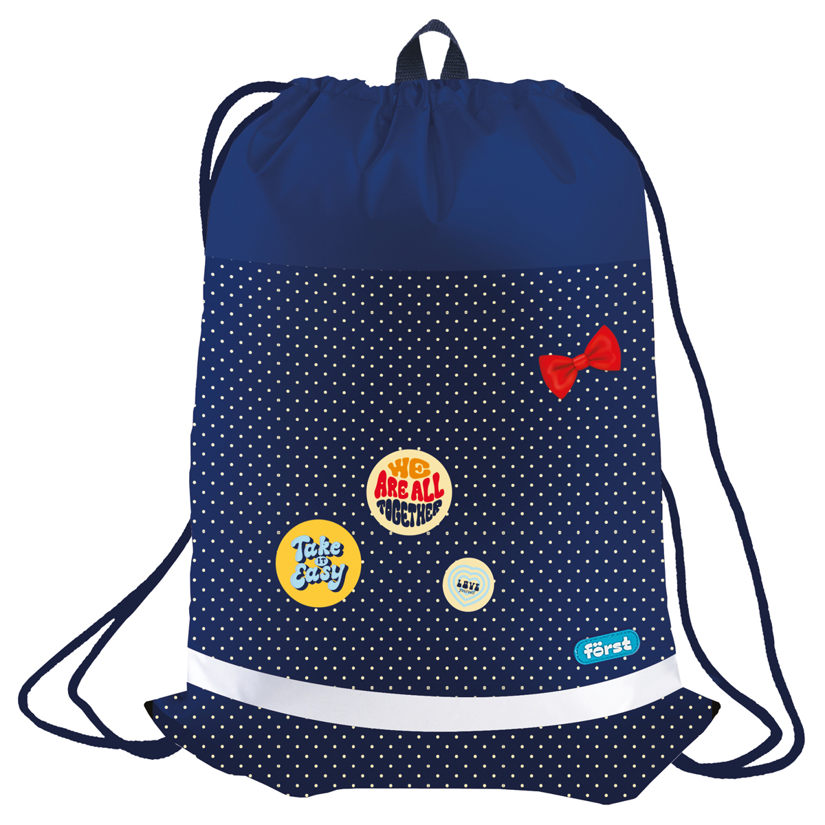 Мешок для обуви F?rst «Горошек» с широкими шнурками, светоотражающей полосой и вентиляционной сеточкой сзади. Размер изделия 470*360 мм. Изготовлен из прочного полиэстера. Благодаря петле мешок удобно вешать. Подходит как для обуви, так и для спортивной формы.