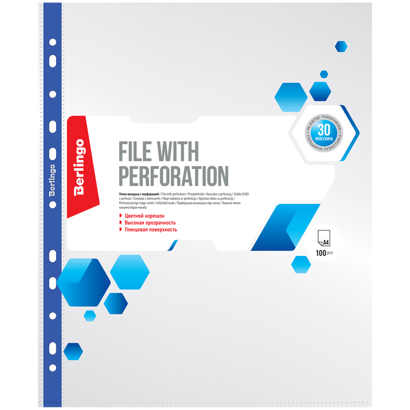 Папка-вкладыш с цветным корешком Berlingo, А4, 30мкм, глянцевая, ассорти (S10301)описаниеПапка - вкладыш с универсальной перфорацией для хранения неперфорированных документов А4. Толщина пластика 30 мкм, глянцевая поверхность, высокая прозрачность. Цветной корешок ассорти (синий, черный, красный, зеленый) для сортировки документов. Упаковка в пакет по 100шт. Сумма заказа всех товаров с этого склада должна быть не менее 3000 р. Доставка от 4 дней