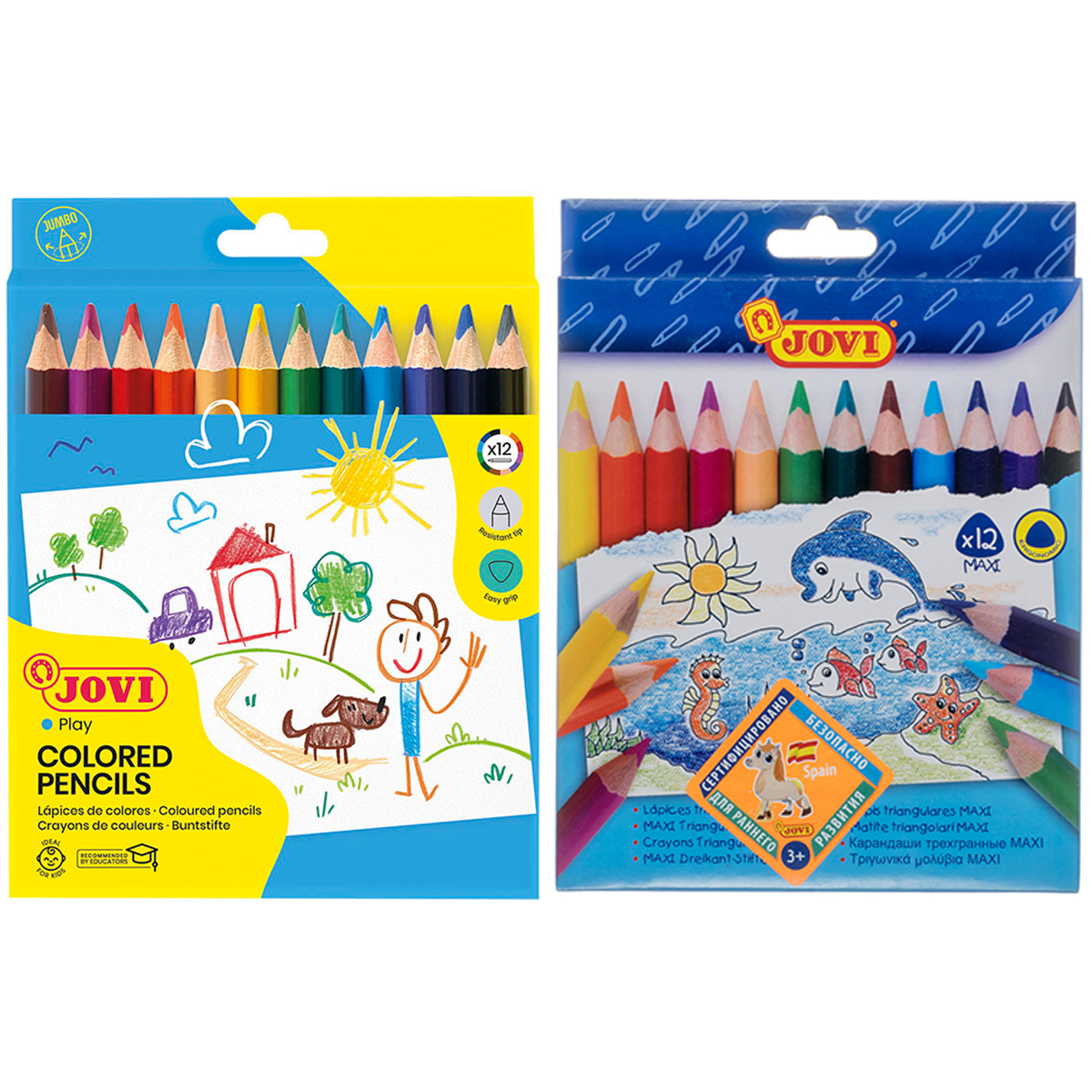 Специальные утолщенные трехгранные деревянные карандаши толщиной 10 мм, длиной 175 мм. Для самых маленьких детей, которые только учатся рисовать. Удобная треугольная форма корпуса эргономична, тренирует навык правильного захвата, снижает нагрузку на кисти рук, утолщенный грифель диаметром 5 мм проводит толстые и яркие линии. Рисуют на бумаге, ватмане, картоне. Палитра из двенадцати красивых чистых цветов (желтый, красный, телесный, зеленый, голубой, синий, фиолетовый, оранжевый, розовый, темно-зеленый, коричневый, черный). Грифель приклеен к деревянному корпусу, что предохраняет его от поломок при падении. Не содержат глютен и основные аллергенные компоненты. Купите товар «Карандаши цветные JOVI Maxi , 12цв., трехгран., утолщенные, заточен., картон, европодвес (735/12)» по оптовой цене с доставкой или самовывозом.