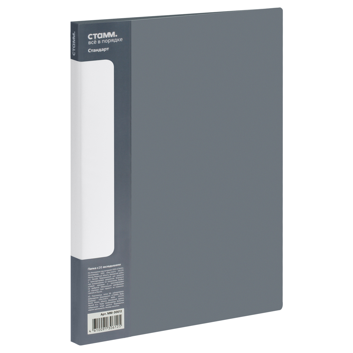 Папка с 20 вкладышами СТАММ "Стандарт" предназначена для хранения бумаг формата А4. Цвет папки – серый. Папка изготовлена из качественного полипропилена толщиной 600 мкм с текстурой «песок». Тип скрепления – термосварка. Размер изделия составляет 235*310 мм. Ширина корешка – 14 мм. Бумагам, вложенным в папку, не требуется перфорация дыроколом. На корешке папки имеется карман. Папка упакована в индивидуальный пакет. • Размер: 235*310 мм; • Толщина материала: 600 мкм; • Формат: А4; • Количество вкладышей: 20; • Цвет: серый; • Тип скрепления: термосварка; • Ширина корешка: 14 мм. Купите товар «Папка с 20 вкладышами СТАММ Стандарт А4, 14мм, 600мкм, пластик, серая (ММ-30612)» по оптовой цене с доставкой или самовывозом. Заказывайте, пока этот товар не раскупили! Товар производится под торговой маркой «СТАММ», что говорит о высоком качестве продукции.