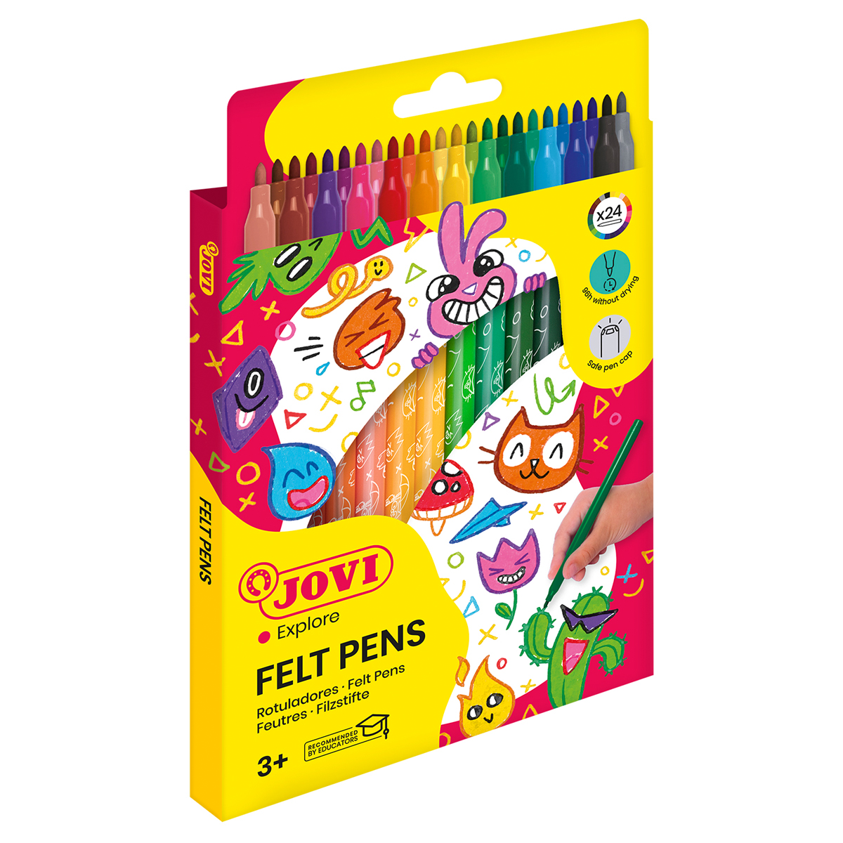 Фломастеры представлены с коническим наконечником. Пластиковый корпус трехгранной формы с треугольной формой захвата, которая тренирует навык правильного захвата и снижает нагрузку на кисти рук. Полностью безопасные чернила на водной основе с пищевыми красителями. Фломастеры не высыхают без колпачка в течение 96 часов. Специальные вентилируемые колпачки обеспечивают прохождение воздуха при случайном проглатывании. Фломастеры JOVI легко смываются с кожи и отстирываются с большинства видов тканей.