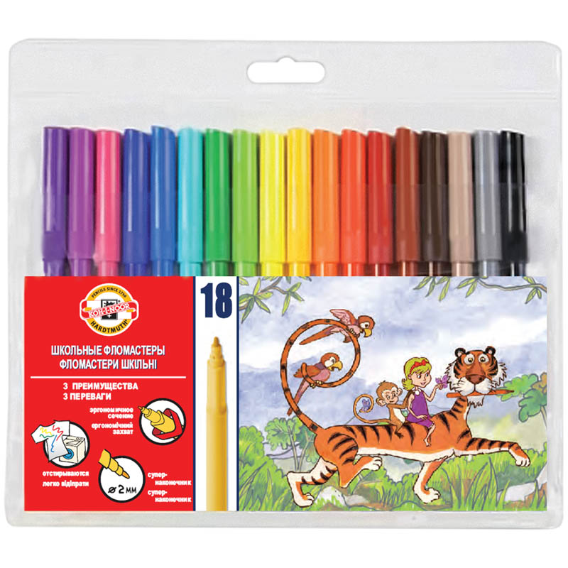 Фломастеры Koh-I-Noor Звери , 18цв., трехгранные, смываемые, ПВХ, европодвес (771002AH04TERU)