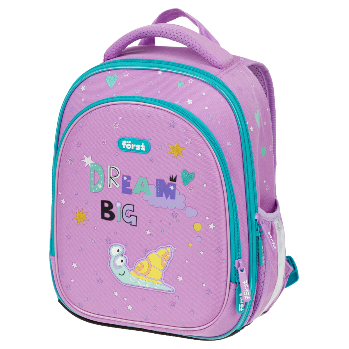 Ранец F?rst F-LIGHT Snail dream размером 37*28*16 см и объемом 17 литров с двумя отделениями и двумя внешними карманами, разделителями для учебников и тетрадей, карманом на молнии, съемным карабином для ключей, именной карточкой. Передняя часть и спинка ранца жесткие, а боковые панели уплотнены слоем спонжа. благодаря анатомической формованной спинке из ЭВА-материала, а также регулируемым по длине лямкам и нагрудному креплению, он плотно фиксируется на спине ребенка. Дно — из водонепроницаемого материала с пластиковыми ножками для защиты от влаги. Ранец с плотной ручкой и петлей для подвешивания. Световозвращающие элементы на передней части, сбоку и на лямках обеспечивают безопасность в темное время суток.