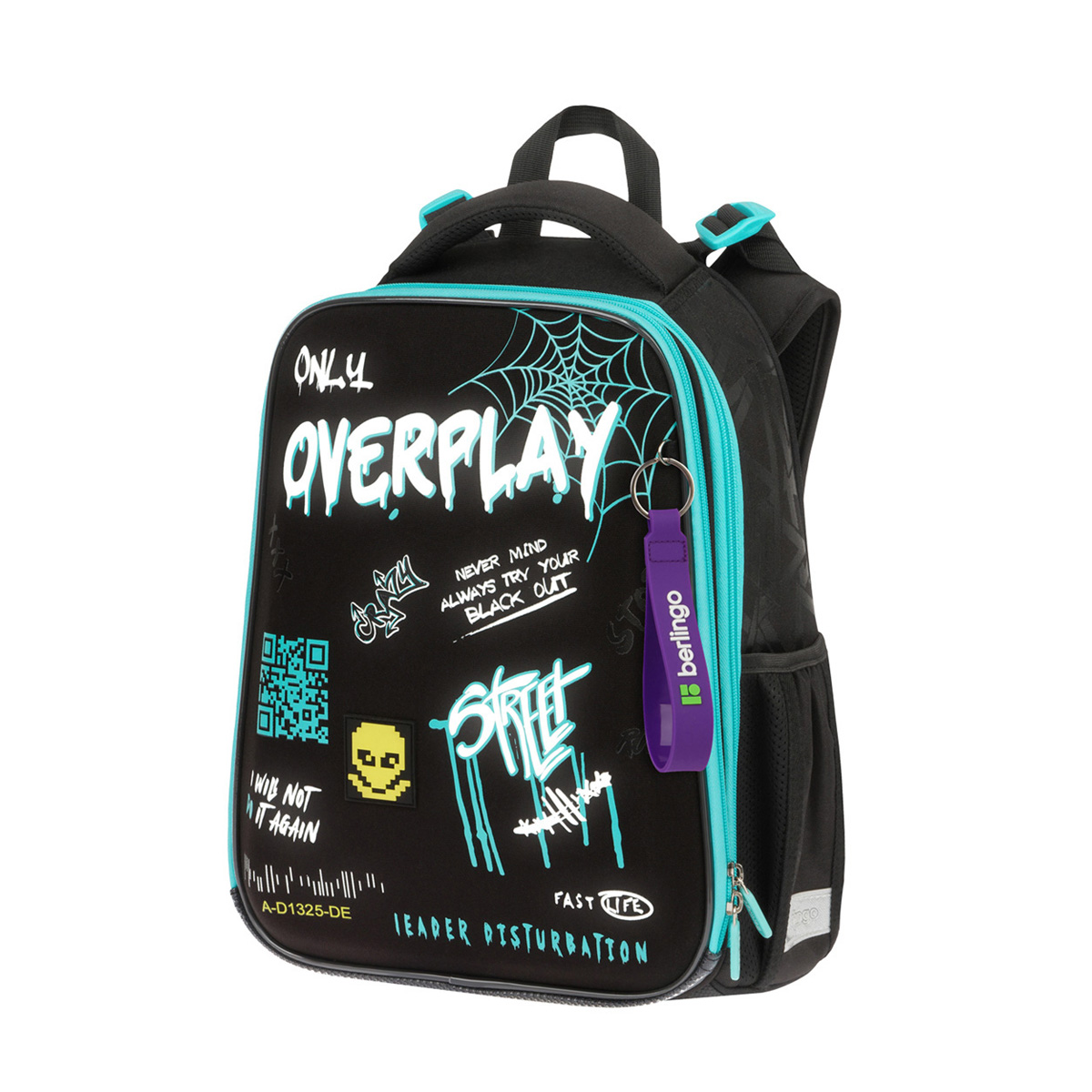 Ранец Berlingo Expert Overplay размером 37*28*16 см и объемом 16, 5 литра имеет 2 отделения, 2 боковых кармана, съемный кошелек на лямке для быстрого доступа к необходимым вещам. Внутри — разделители для тетрадей и учебников, органайзер, карман для смартфона, съемный карабин для ключей и именная карточка для подписи. Снаружи — экологичный ЭВА-материал с покрытием из прочной нейлоновой ткани, уплотненная мягкая ручка и петля для подвешивания к парте, дно из водонепроницаемого материала с пластиковыми ножками, световозвращающие элементы на лямках, передней и боковых частях ранца — для безопасности ребенка в темное время суток. Не боится влаги.