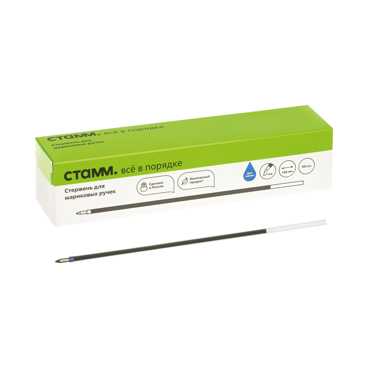 Стержень шариковый СТАММ синий, 140мм, 0,7мм (СТШ-30333)описаниеСтержень шариковый «СТАММ» предназначен для замены исписанного стержня шариковой ручки. Толщина линии – 0,5 мм, диаметр пишущего узла – 0,7 мм. Длина стержня – 140 мм. Синие чернила пониженной вязкости на масляной основе обеспечивают мягкое и плавное письмо, не текут и не мажутся. Износостойкий наконечник и большой запас чернил позволяют долго использовать ручку для ведения записей. Длина линии письма в два раза больше стандартной – 1 500 м. В картонной упаковке – сто стержней.