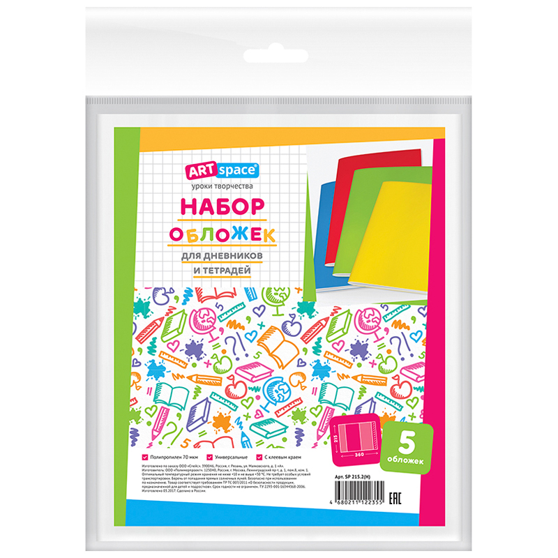 Набор универсальных обложек для дневников и тетрадей из полипропилена 70 мкм с клеевым краем Купите товар «Набор обложек (5шт.) 215*360 для дневников и тетрадей, универсальная с липким слоем, ArtSpace, ПП 70мкм (SP 215.2(Н))» по оптовой цене с доставкой или самовывозом. Заказывайте, пока этот товар не раскупили! Товар производится под торговой маркой «Спейс», что говорит о высоком качестве продукции.