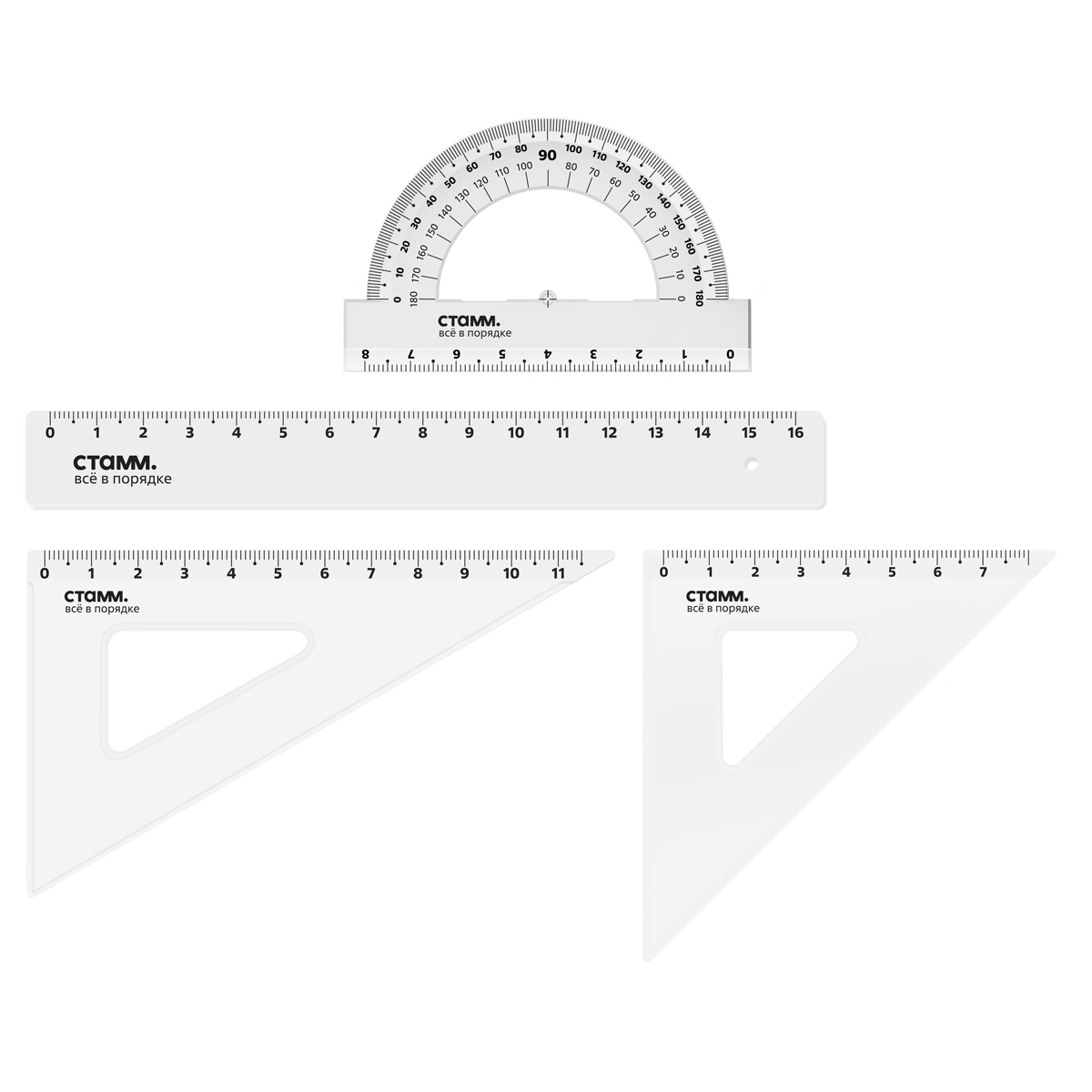 Изделия имеют безопасные закруглённые углы и чёткую миллиметровую шкалу. Изготовлены из качественного полистирола, и имеют гладкую глянцевую поверхность. Упакованы в пакет с европодвесом. Цвет изделий - прозрачный бесцветный. Купите товар «Набор чертежный СТАММ, размер S (линейка 16см, 2 треугольника, транспортир), прозрачный, бесцветный, европодвес (НЧ-30524)» по оптовой цене с доставкой или самовывозом.