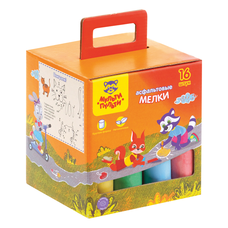 • Диаметр мелка: 24 мм Купите товар «Мелки цветные для асфальта Мульти-Пульти, 16шт., 6цв., круглые картонная коробка (АМ_31725)» по оптовой цене с доставкой или самовывозом.