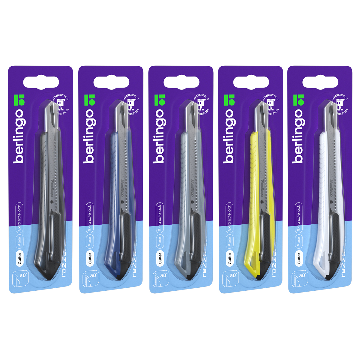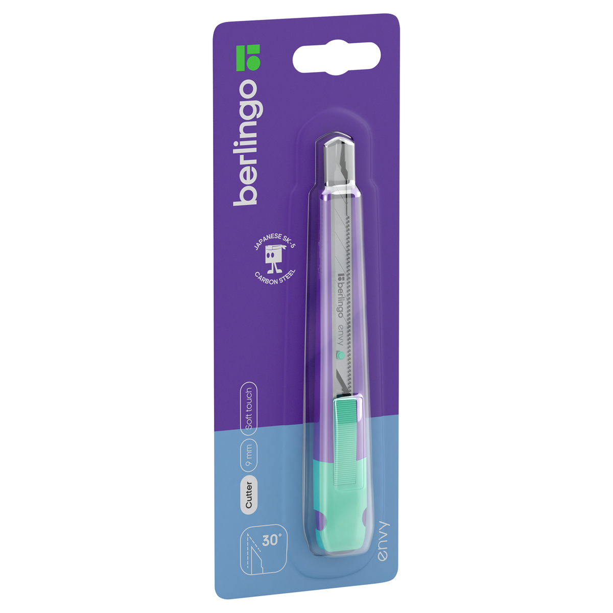 Нож канцелярский 9мм Berlingo Envy , auto-lock, металл. направл., ассорти, европодвес (BM4141)описаниеКанцелярский нож Berlingo кросс-серии Envy с автоматической системой фиксации лезвия auto-lock. Прочный корпус выполнен из качественного ABS-пластика с тактильно приятным покрытием soft-touch, что обеспечивает дополнительный комфорт при использовании и предотвращает скольжение пальцев. Износостойкое лезвие шириной 9 мм сделано из стали SK5 с углом заточки 30°, который гарантирует чёткость среза. Нож оснащён металлическими направляющими для плавного движения лезвия.