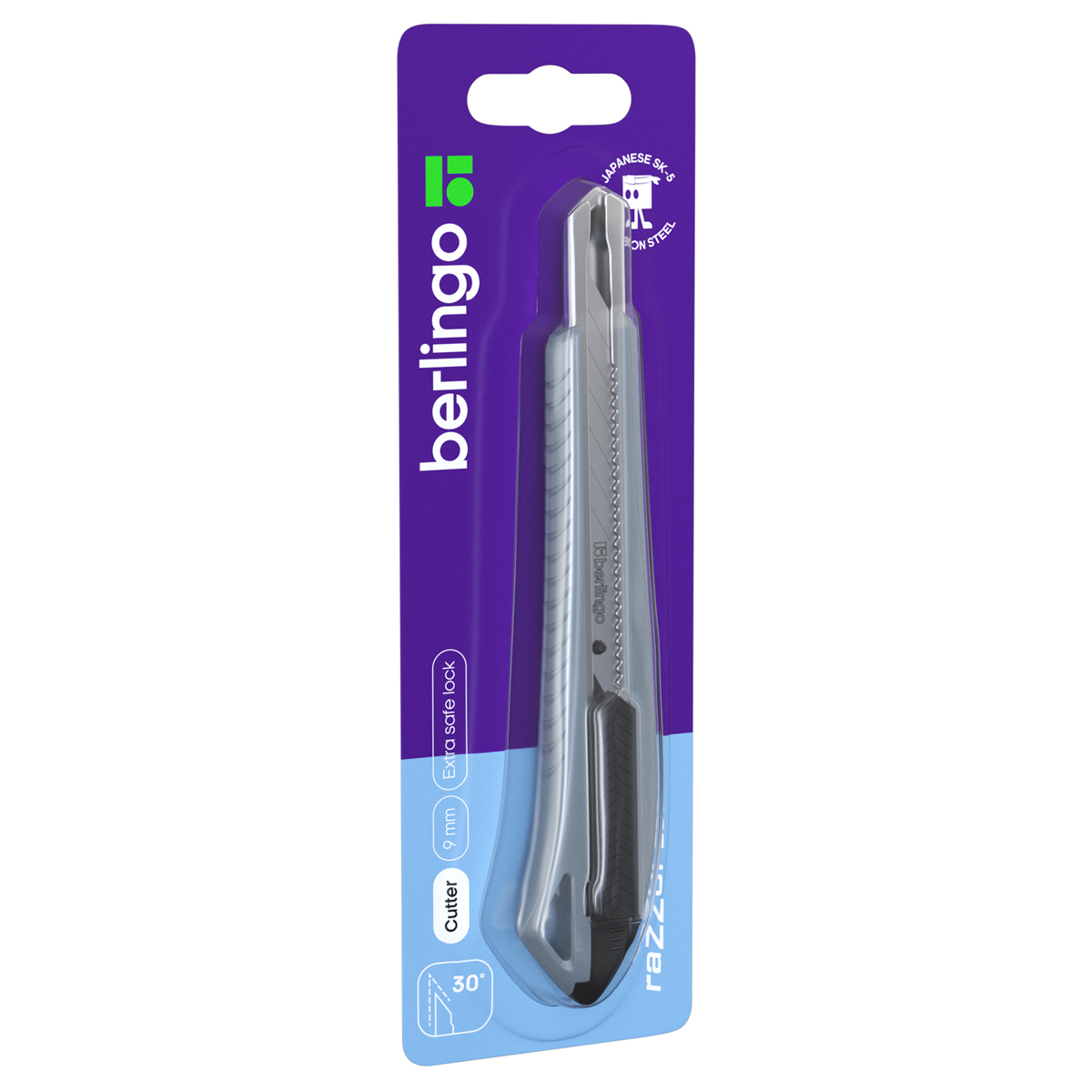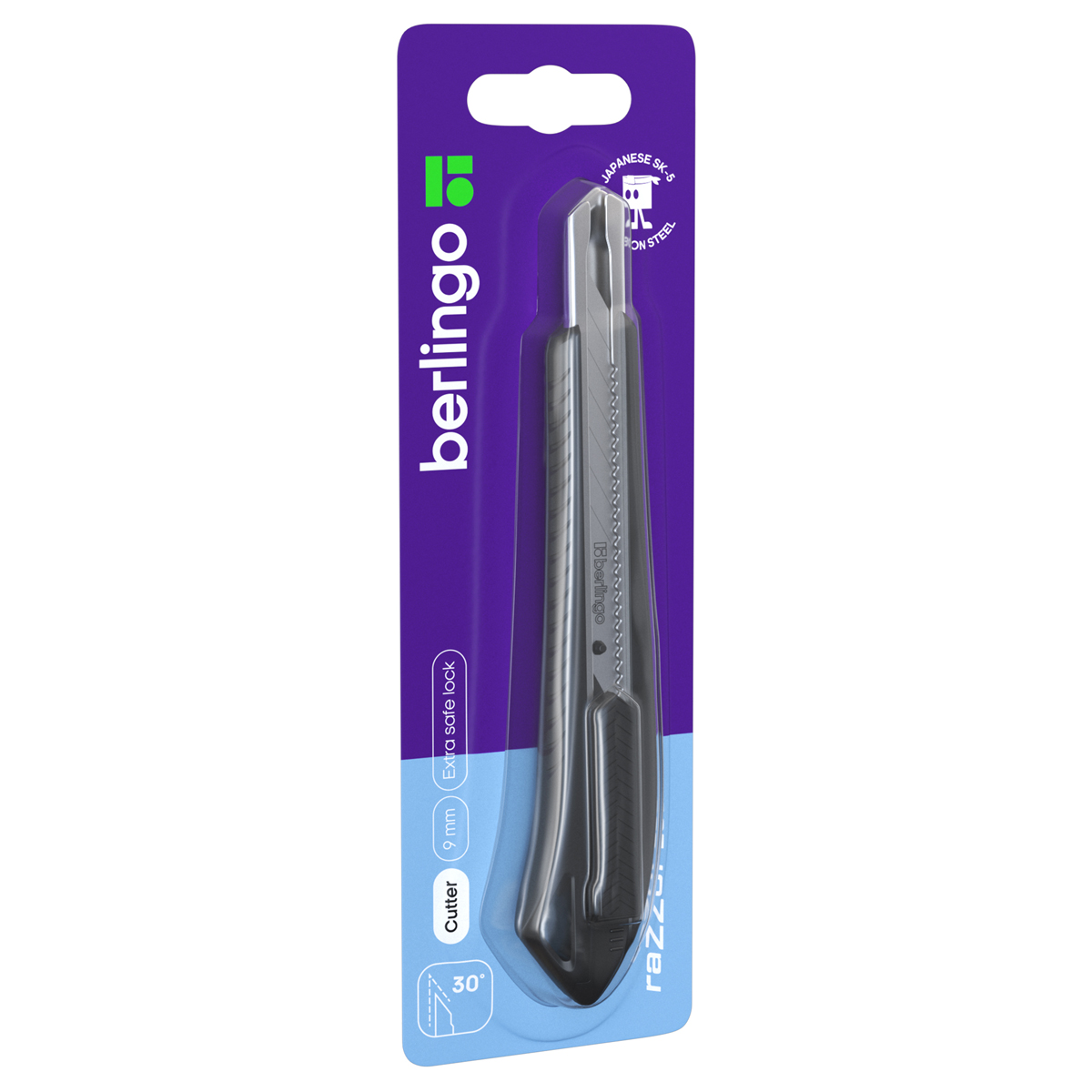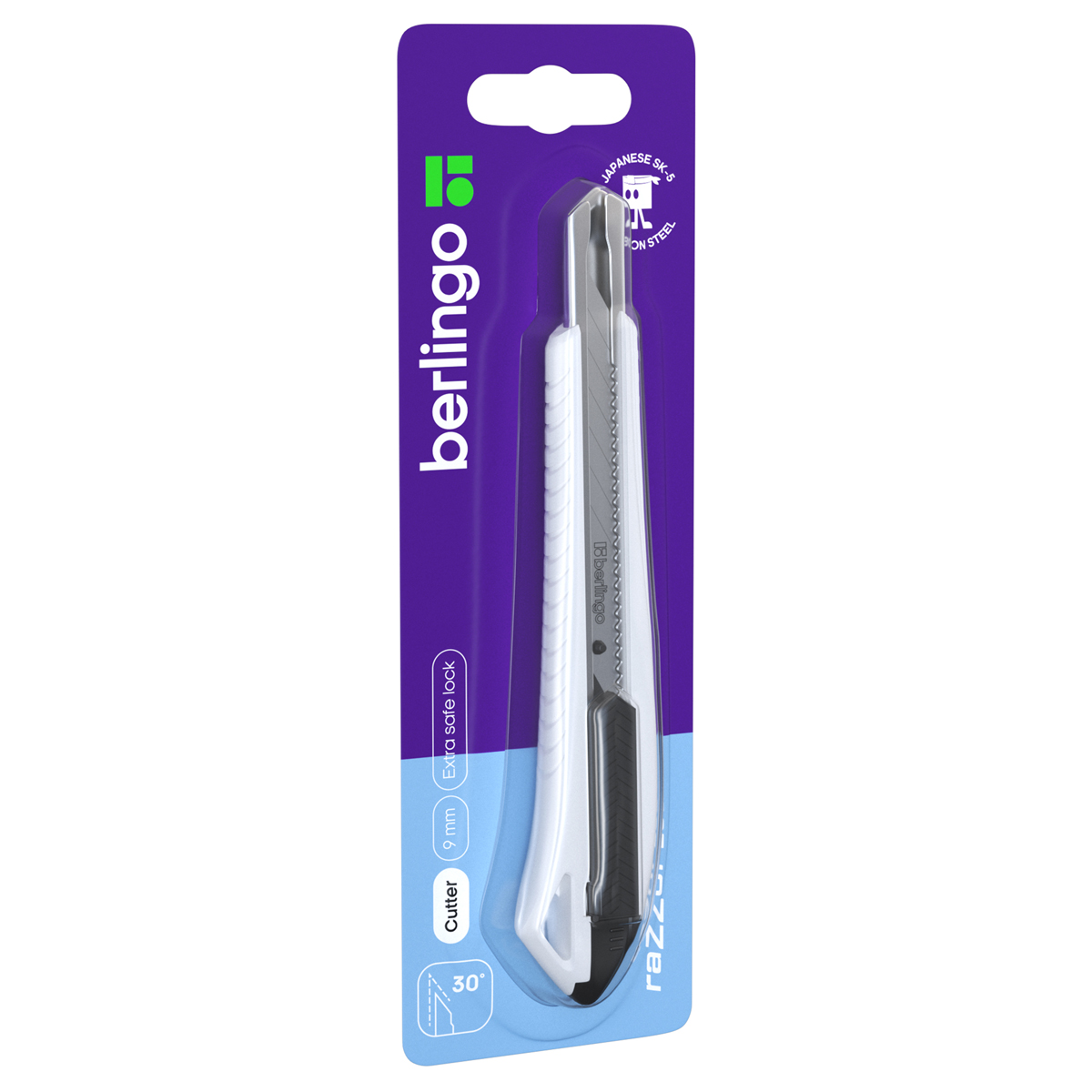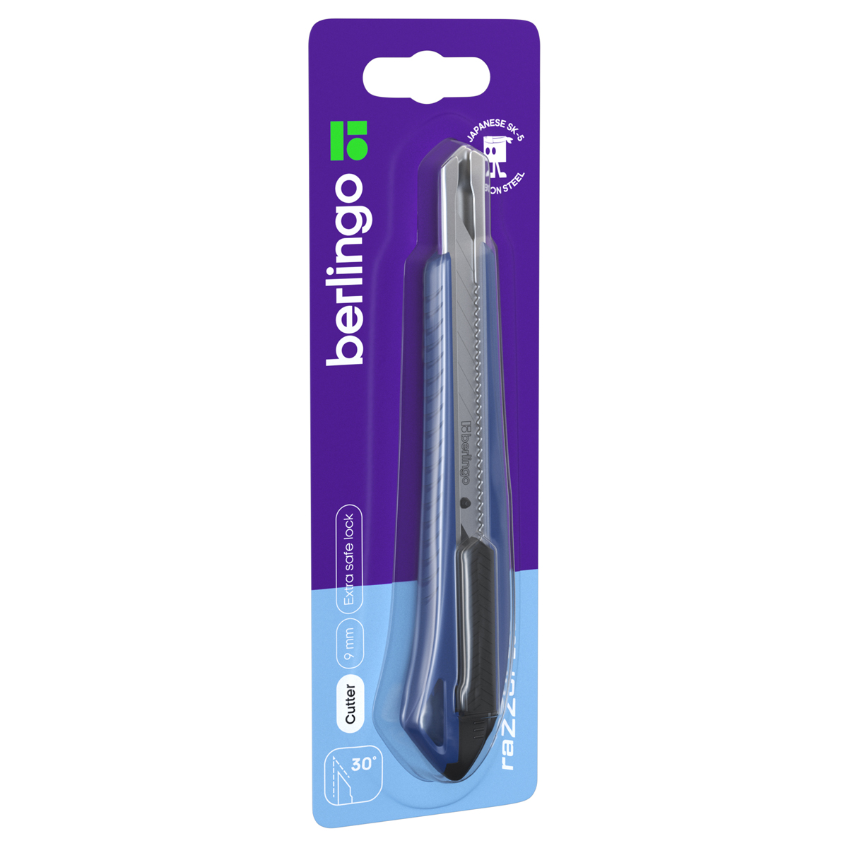Нож канцелярский 9мм Berlingo Razzor 300 , auto-lock, металл. направл., мягкие вставки, синий, европодвес (BM4131_c)описаниеКанцелярский нож Berlingo серии Razzor 300 с автоматической системой фиксации лезвия auto-lock. Комплектуется износостойким лезвием из стали SK5 с углом 30°. Ширина лезвия: 9 мм. Корпус ножа синего цвета выполнен из высококачественного ABS пластика с применением технологии двойного литья (прорезиненные вставки). Имеет металлические направляющие. Индивидуальная упаковка – блистер с европодвесом. На оборотной стороне блистера есть перфорация для более удобного извлечения инструмента из упаковки.