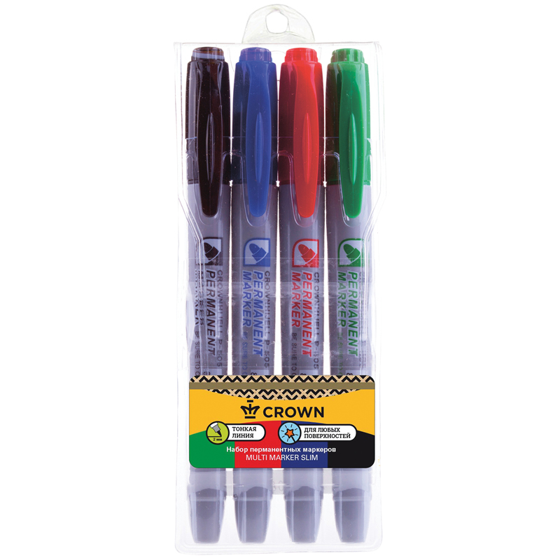 Перманентный маркер Crown - качество, проверенное временем. Купите товар «Набор перманентных маркеров Crown Multi Marker Slim 04цв., пулевидный, 2,0мм, чехол с европодвесом (P-505-4)» по оптовой цене с доставкой или самовывозом.