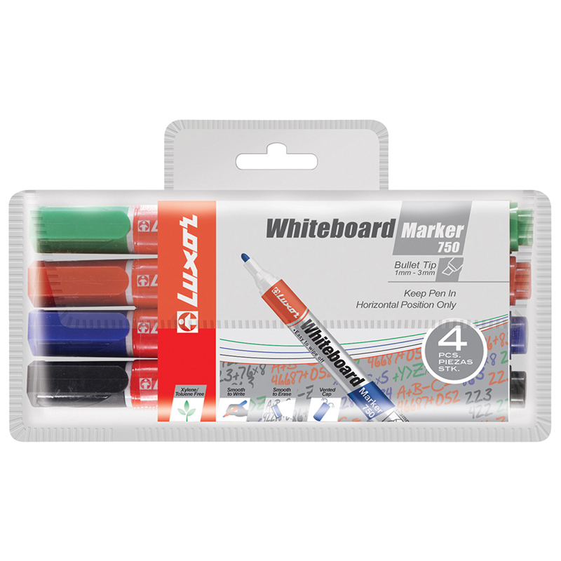 Пиши ярко и стирай без остатка маркерами для белых досок TM Luxor! Купите товар «Набор маркеров для белых досок Luxor 750 04цв., пулевидный, 1-3мм, чехол с европодвесом (3380/4 WT)» по оптовой цене с доставкой или самовывозом.