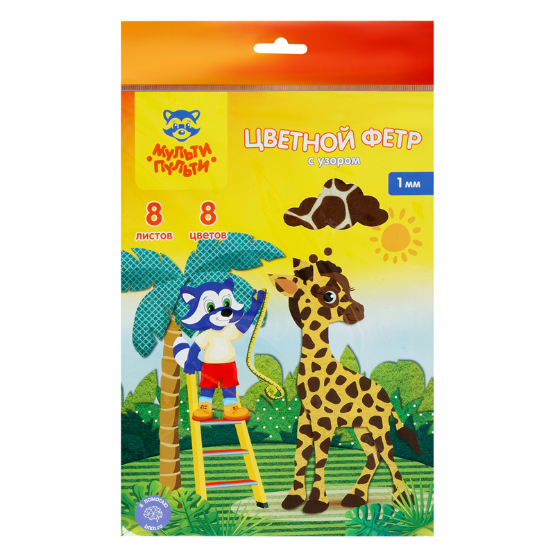 Фетр Мульти-Пульти, А4, 8л., 8цв., 2мм, с тиснением фольгой, Енот в космосе (ФЦ8ф_38697)описаниеНабор цветного мягкого фетра Мульти-Пульти с тиснением фольгой отлично подойдет для творческих работ, аппликаций и различных поделок. Фольгированный рисунок блестит и придает поделке интресный и необычный вид. В наборе представлена палитра из 8 цветов. Листы имеют размер 200*285мм. Толщина листа 2мм. Сумма заказа всех товаров с этого склада должна быть не менее 3000 р. Доставка от 4 дней