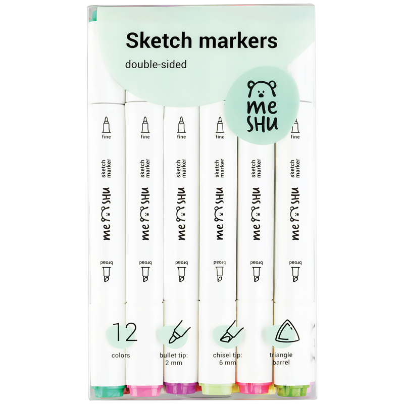 Набор двусторонних маркеров для скетчинга MESHU 12цв., цветочная гамма, корпус трехгранный, пулевид./клиновид.наконечники, ПВХ-бокс (MS_38261)описаниеНабор двусторонних маркеров для скетчинга Meshu - идеальный выбор для художников, дизайнеров, иллюстраторов и любителей скетчинга, подходят для создания анимэ и манги. Эргономичный трехгранный корпус удобно лежит в руке и позволяет эффективно прорабатывать мелкие детали рисунка. Чернила на спиртовой основе - быстро высыхают, водостойкие, нетоксичны и не портят поверхность бумаги. Маркеры обладают пулевидным (2мм) и скошенным (6 мм) наконечниками, что позволяет прорабатывать как мелкие детали рис ... [Подробнее на странице товара]Сумма заказа всех товаров с этого склада должна быть не менее 3000 р. Доставка от 4 дней