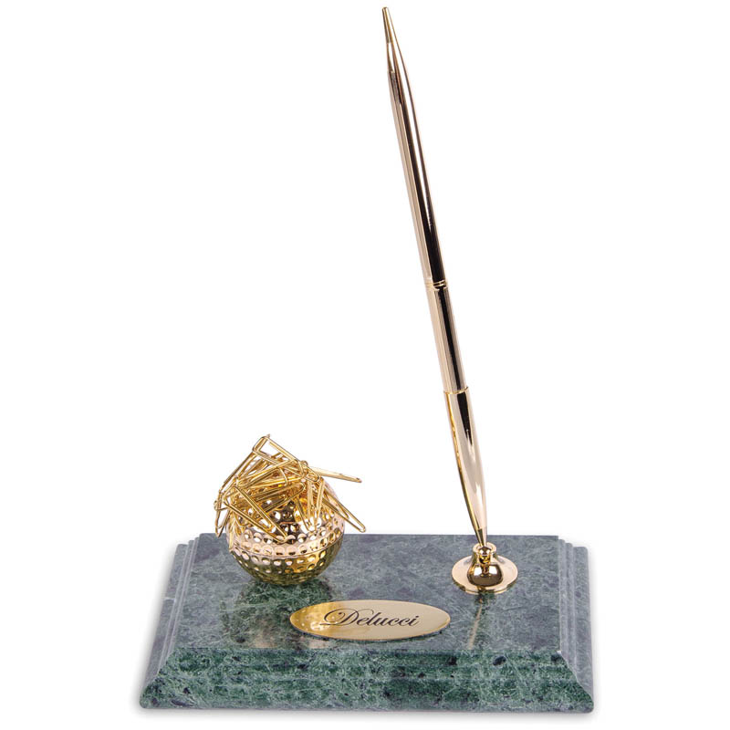 Стильная подставка под ручку с диспенсером для скрепок Delucci может стать отличным украшением рабочего стола. Корпус выполнен из мрамора красивого зелёного цвета, а фурнитура – из прочного металла. Магнитный диспенсер сделан в виде мяча для гольфа. В комплекте есть шариковая ручка с синими чернилами и скрепки. Подставка Delucci упакована в аккуратную бордовую коробку.
