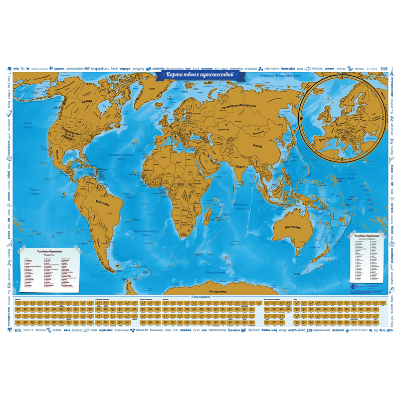 Карта твоих путешествий Мир политическая со скретч-покрытием Globen, 860*600мм, в тубусе (СК057)описаниеНа карту нанесен специальный скретч-слой, который можно стереть обычной монеткой. После посещения страны отметьте ее на карте стерев защитный слой с карты. На карте под стираемым слоем путешественника ждет сюрприз - заметки путешественника, которые обязательно напомнят о посещенной стране. Карта упакована в фирменный подарочный тубус из жесткого картона. Сумма заказа всех товаров с этого склада должна быть не менее 3000 р. Доставка от 4 дней