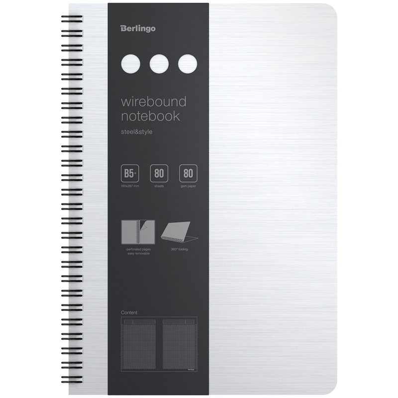 Бизнес-тетрадь Berlingo "Steel&Style" - это практичное, стильное и современное изделие для планирования и записей. Такая бизнес-тетрадь является незаменимым инструментом для деловых людей. Увеличенная толщина обложки (1500мкм) в сочетании с фактурой "сталь", формата B5+. Материал обложки - трехслойный пластик (полифом), надежно защищает внутренний блок от влаги, замятия и загрязнения, обложка устойчива к загрязнениям. Белый цвет внешней стороны, в сочетании с черным цветом внутренней поверхности. Вид скрепления – гребень со стильными черными кольцами, который дает возможность раскрывать тетрадь на 360?. Бизнес-тетрадь содержит съемную брендированную линейку, которую можно использовать как закладку или разделитель и с легкостью можно перемещать в удобное место. Внутренний блок – высококачественная тонированная бумага, плотностью 80г/м2, 80 листов в клетку, рамка для заголовка, темы или даты, поля с обеих сторон блока на каждом листе, линовка на вылет. Внутренний блок имеет микроперфорацию для ровного отрыва листа и дальнейшего хранения или подшивки в аккуратном виде. Размер бизнес-тетради 265*190 мм, диаметр гребня 21 мм. Упаковка в термоусадочную пленку позволяет предохранить листы от замятия и загрязнения в процессе транспортировки. Купите товар «Бизнес-тетрадь В5+, 80л., Berlingo Steel Style , клетка, на гребне, 80г/м2, пластик. (полифом) обложка, линейка-закладка, белая (WNt_B5004)» по оптовой цене с доставкой или самовывозом.